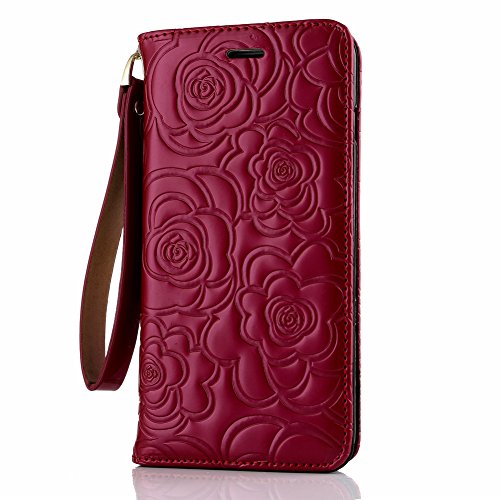 iPhone 6s Plus Case, Premium Vintage 3D Embossed Floral PU Leather Magnetic Folio Wallet Case ID Credit Card Slots for Apple iPhone 6/6s Plus 5.5 Inch (Red Purple)