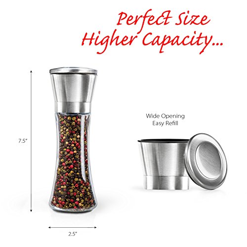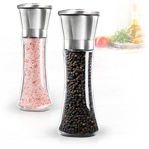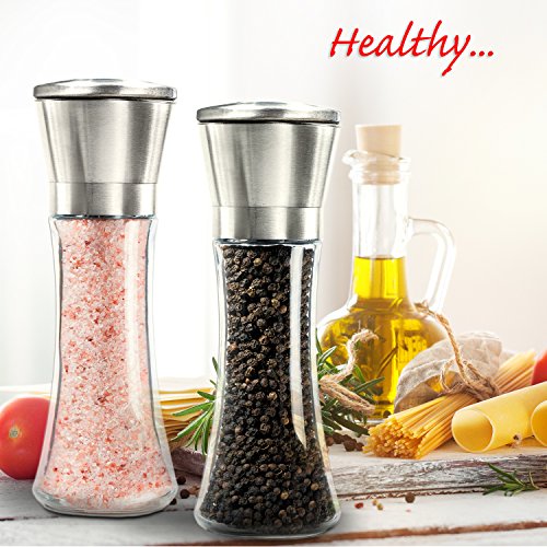 Awesome Look The body of Gudaco Salt and Pepper Shakers is made of glass so you can easily see beautiful color of your spices. It can be black, white or colored pepper, white sea salt, pink himalayan salt. It looks really awesome on a table in your kitchen.