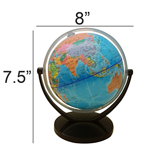 DIMENSIONS: Stands 7.75 inches tall. 8 inches wide. 5.5 inch diameter. COLORS: Globe stand on black base. Countries are in bold colors. Oceans are in vibrant blue colors. QUALITY: Strong, durable; long lasting.