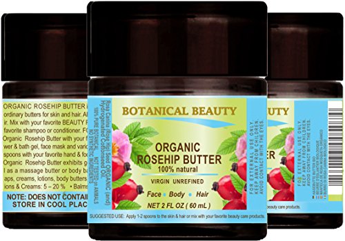 -. Feature : One of the natural antioxidant butters to slow down premature aging and to reduce the formation of wrinkles and scars. A Little Goes a Long Way, Absorbs Quickly, Not Greasy, Unscented, Chemical Free, Not tested on Animals, DOES NOT CONTAIN ANY PRESERVATIVES. / ROSEHIP BUTTER ORGANIC is rich in essential fatty acids, vitamins and minerals. It has natural antioxidant properties and it slows down premature aging, improves skin elasticity, regenerates skin cells, and reduces the formation of wrinkles, and scars. ROSEHIP BUTTER ORGANIC helps to heal dry, chapped and cracked skin, balances the moisture in skin, and well conditions the hair. / ROSEHIP BUTTER ORGANIC helps the skin's barrier function to maintain moisture levels and to maintain a healthy protective layer, relieving irritation, dryness and peeling, reducing the appearance of wrinkles and leaving skin soft and smooth. It will help to keep your skin healthy. ROSEHIP BUTTER ORGANIC is suitable for all skin types, especially for dry or mature aging skin. / ROSEHIP BUTTER ORGANIC helps damaged skin like BURNS, WOUNDS, CUTS, SCARS, ITCHY, SCALY, IRRITATED SKIN CONDITIONS SUCH AS ECZEMA AND PSORIASIS. Also use it on areas that need extra attention like the elbows and knees. / ROSEHIP BUTTER ORGANIC helps for DAMAGED HAIR, DRY SCALP AND BRITTLE NAILS. ROSEHIP BUTTER ORGANIC promotes silky soft hair, prevents moisture loss and adds elasticity and suppleness, and also provides an immediate sparkle and shine, and helps to mend split ends.