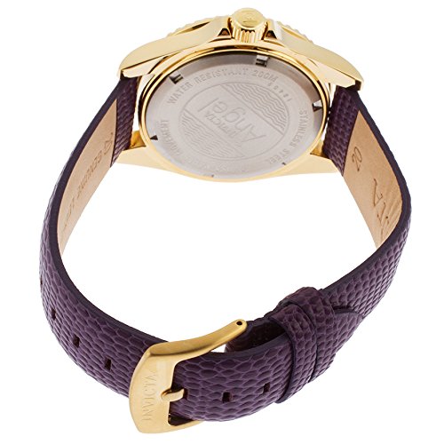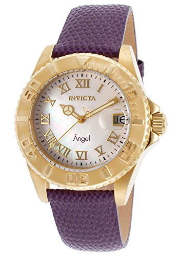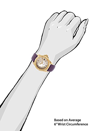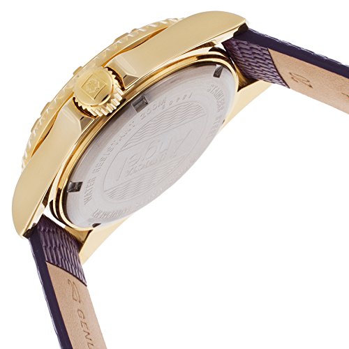 White mother of pearl dial with gold tone and pale green hands and gold tone roman numerals; luminous; unidirectional 18K gold ion-plated stainless steel bezel; screw-down crown; mineral crystal; 18K gold ion-plated stainless steel case; violet leather strap
