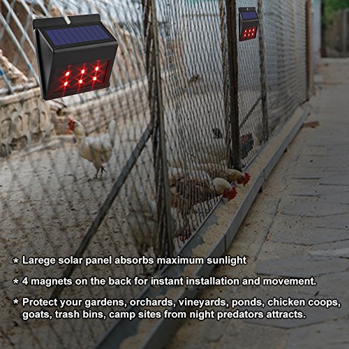 REPELS ALL COMMON NIGHT PREDATORS: Fox, deer, wolf, coyote, skunk, bear, owls, hawks and more. PROTECT your gardens, orchards, vineyards, ponds, chicken coops, goats, trash bins, camp sites from night predators attracting.