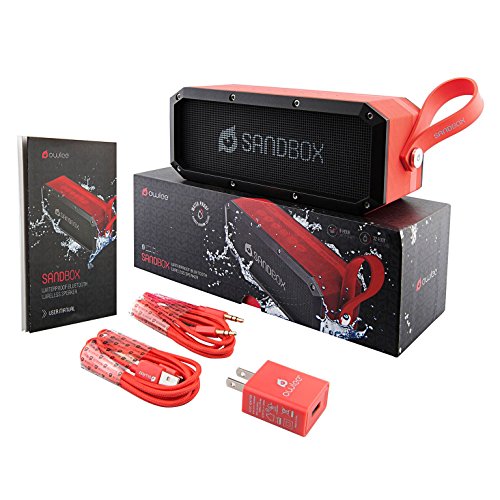 The OWLEE SANDBOX Bluetooth speaker features a solid construction and a rubberized coating with a silicone loop that makes it Shockproof, Sandproof and Dustproof, The IPX5 rating means that this speaker is fully waterproof so you can use it at the beach, pool, gym, boat, bath, backyard, camping, biking, without having to worry about dropping it or water damage.