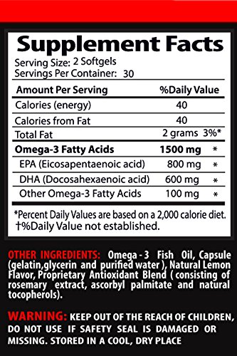 -. Binding : Health and Beauty -. Brand : VIP Vitamins, LLC -. Color : Black -. EAN : 0755702138918 -. Feature : OMEGA FISH OIL: It is a perfect dietary compliment for loosing weight, bodybuilding, reducing inflammation, a slim waist, and optimum nutrition. / SOFTGELS ARE EASY TO SWALLOW: Our softgels are specially coated that makes them easy to swallow and leaves no fishy aftertaste. The Enteric Coating helps to absorb the omega 3 supplement by enriching your body. / MOLECULARY DISTILLED TO REMOVE EXCESS TOXINS: Our Omega 8060 supplements are 100% Pure and Toxin Free. Our fish oil which removes any excess toxins.Supports heart health, brain function, cholesterol balance, joints and inflammation and immune system. / OTHER INGREDIENTS: Omega -3 Fish oil, Capsule (gelatin, glycerin and purified water), Natural Lemon Flavor, Proprietary Antioxidant blend (consisting of rosemary extract, ascorbyl palmirate and natural tocopherols). / OUR GUARANTEE: 60 capsules of our Omega Fish Oil 0860 by VIP Vitamins will be benefitial for the support of cardiovascular, brain and nervous system health -. Label : VIP Vitamins, LLC -. Manufacturer : VIP Vitamins, LLC -. PackageQuantity : 2 -. ProductGroup : Health and Beauty -. ProductTypeName : HEALTH_PERSONAL_CARE -. Publisher : VIP Vitamins, LLC -. Studio : VIP Vitamins, LLC -. Title : Omega Fish Oil - Supplement with DHA and EPA Essential Fatty Acids 1500mg Extra Strength (2 bottles 120 softgels) -. UPC : 755702138918
