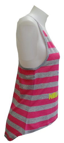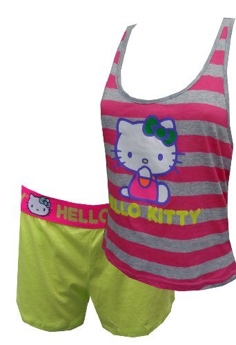 Bold and fun! These pajama sets for women feature Hello Kitty on a bold striped background. The athletic style tank is intentionally longer in the back. Paired with bright neon elastic waist shorts, this set is super fun. Machine wash, junior cut.
