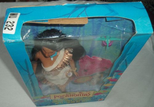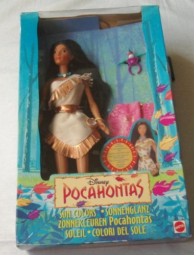 -. Binding : Toy -. Brand : Mattel -. Color : multi-colored -. EAN : 0792491214553 -. Feature : Sunlight makes leaves appear on her dress / Comes with a Flit ring and blanket -. IsAdultProduct : 0 -. Label : Mattel -. LegalDisclaimer : This toy is not suitable for children who still put objects in their mouths. Contains small parts. -. Manufacturer : Mattel -. MPN : 0302us4961amn0hc -. PackageQuantity : 1 -. PartNumber : 0302us4961amn0hc -. ProductGroup : Toy -. ProductTypeName : TOYS_AND_GAMES -. Publisher : Mattel -. Studio : Mattel -. Title : Disney Sun Colors Pocahontas Doll by Mattel -. UPC : 792491214553