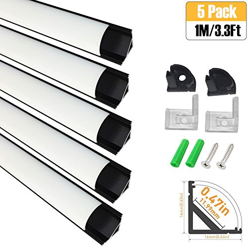 LightingWill 5-Pack V-Shape LED Aluminum Channel System 3.3ft/1M Anodized Black Corner Mount Extrusion for <12mm width SMD3528 5050 LED Strips with Milky White Cover, End Caps, Clips V02B5