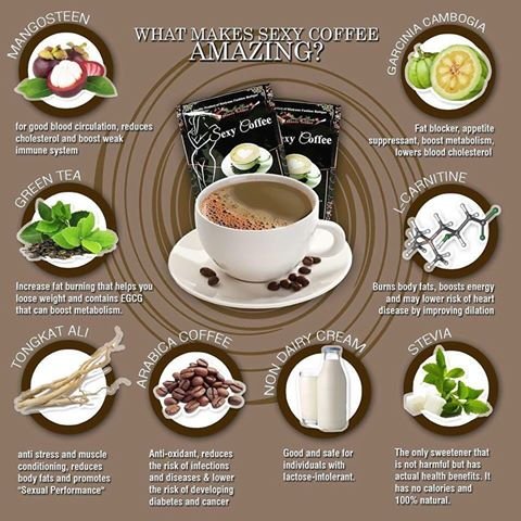 -. Feature : SEXY COFFEE 8 IN 1 Instant Arabica Slimming Coffee - 10 Sachets / Natural and healthy ingredients- GARCINIA CAMBOGIA, Green Tea Extract L-Carnitine, Mangosteen, Tongkat Ali, and Stevia / Designed to help you lose body weight, body fat, improve body composition and improve energy. / Non-dairy and sweetened with stevia. Halal Certified. Safe and effective. / Results may vary from person to person.