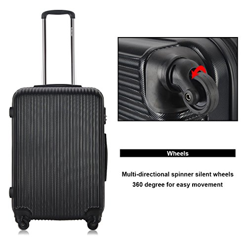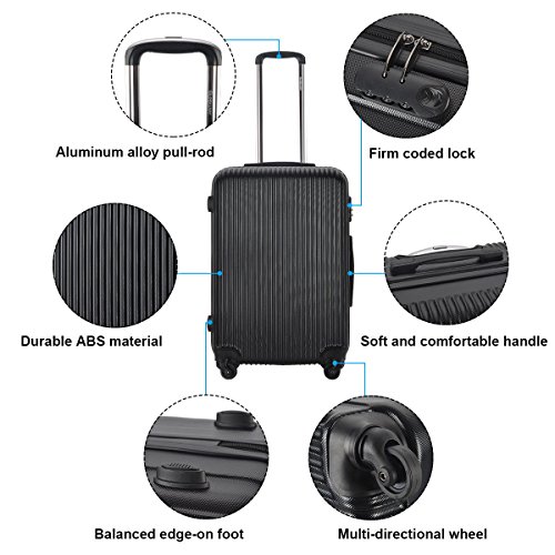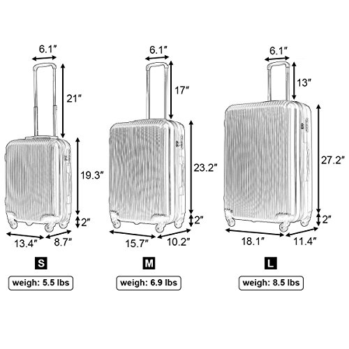 Specifications Material: ABS 210D polyester lining aluminum trolley handle Color: Black Net weight(20"): 5.5lbs Net weight(24"): 6.9lbs Net weight(28"): 8.5lbs Weight capacity(20"): 33lbs Weight capacity(24"): 40lbs Weight capacity(28"): 49lbs Capacity(20"): 35L Capacity(24"): 60L Capacity(28"): 90L Overall dimension(20"): 13.4"L x 8.7"W x 19.3"H Overall dimension(24"): 15.8"L x 10.2"W x 23.2"H Overall dimension(28"): 18.1"L x 11.4"W x 27.2"H Pull rod length(20"): 21" Pull rod length(24"): 17" Pull rod length(28"): 13" Package: 1 x 20" Trolley Case 1 x 24" Trolley Case 1 x 28" Trolley Case 0
