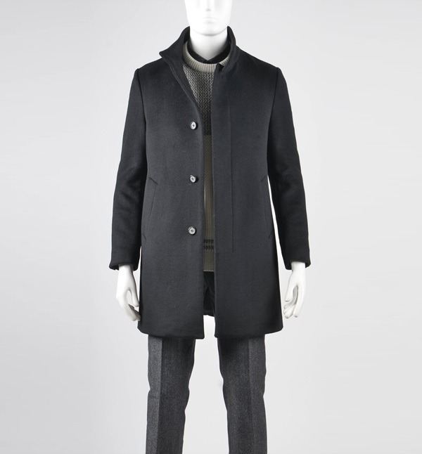 목칼라부분이 하이넥으로 나온 블랙색상의 코트로히든단추와 너무길지않은 길이감으로 포인트를 준 코트입니다.