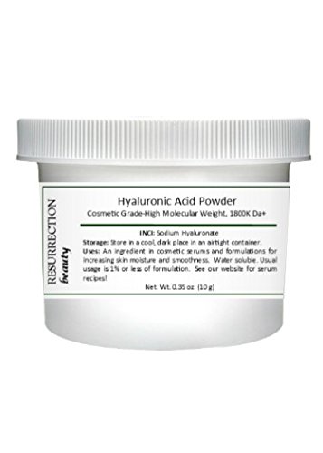 -. Binding : Misc. -. Brand : RESURRECTIONbeauty -. EAN : 0616913145839 -. Feature : Improves skin texture with intense moisture; this powerful humectant is used in the best skin care lines! It locks in 1000 times its weight in water! / Proven anti-aging properties fill-in and diminish the look of fine lines and wrinkles. / See a noticeable difference with visibly plumper, softer and smoother skin. / Save money by making your own serums! It's easy! 10 grams of powder makes 1000 grams of fresh serum! That's a lot of serum! / For best results, please follow mixing directions below. Note: this powder is very fluffy. Settling may occur during shipping, making jar appear only half full. -. PackageQuantity : 1 -. ProductGroup : Beauty -. ProductTypeName : BEAUTY -. Title : Pure Hyaluronic Acid Serum Powder (High Molecular Weight Sodium Hyaluronate). Popular Anti-Aging, Anti-Wrinkle Ingredient For Homemade Serums & Other Skin Care Products. 10 grams By RESURRECTIONbeauty -. UPC : 616913145839