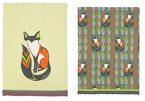 Sarah Watts Sitting Fox and Foxes Designer Kitchen Dish Tea Towels Dishcloths Set of 2