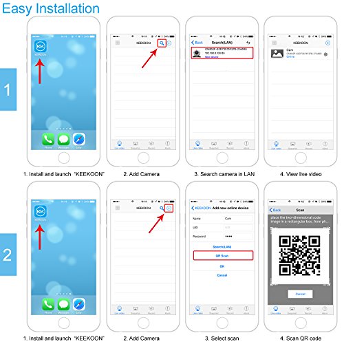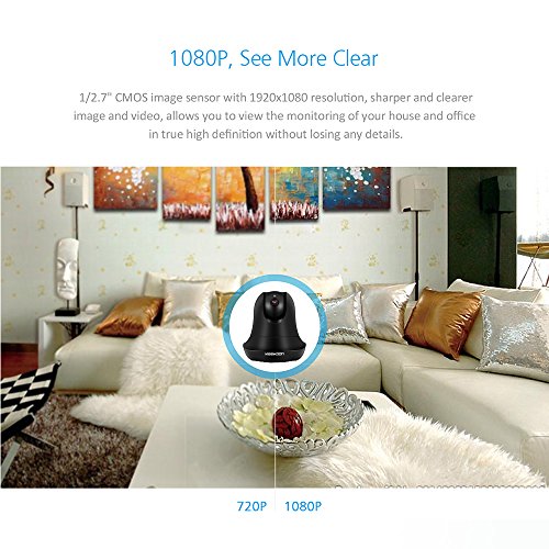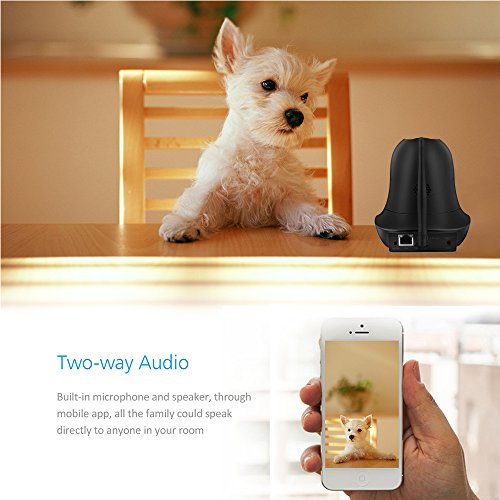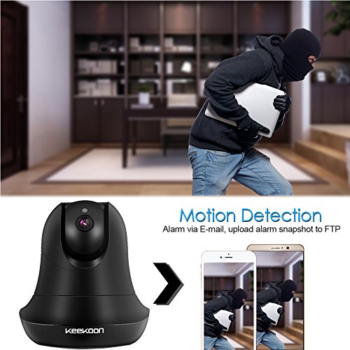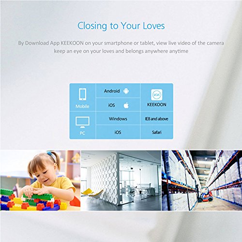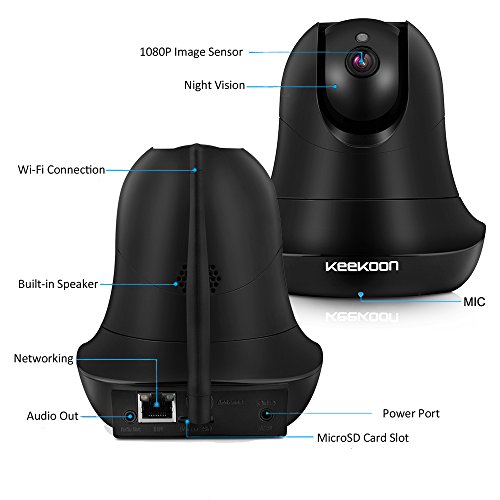-. Feature : 【1080P HD Picture Quality】-- 2.0 Mega pixel 1080P wireless IP security camera,provides clear image and true HD video quality.Allows to install an SD card(up to 64G) if you want to save picture/video locally on the device / 【Night Vision】-- Built-in IR LEDs gives you good light and an excellent monochrome picture,works brilliantly in the dark,support range up to 8m.It can be hung upside down to use / 【Two-way Audio】-- KEEKOON IP camera allows you to talk with your family anywhere anytime with built in mic and speaker,not merely watch it / 【Motion Detection】-- You can receive push alerts or email notification any time when relevant motion is detected / 【Pan and Tilt Functionalities】--With 340° horizontal Pan and 90° vertical Tilt, it can be placed on a tabletop or mounted on the wall,This versatility makes the KeeKoon Cam not only a great security camera, but also a good option to keep tabs on your furry pals or to be used as a baby cam