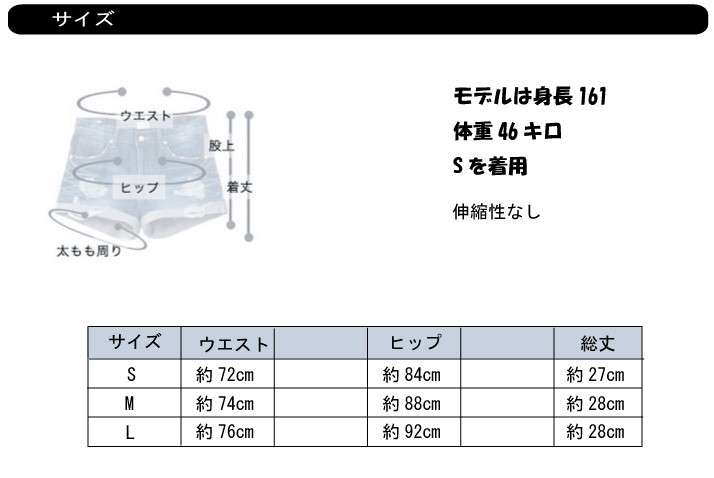 サイズ S ウエスト:72 ヒップ:84 総丈27 M ウエスト:74 ヒップ:88 総丈28 L ウエスト:76 ヒップ:92 総丈28