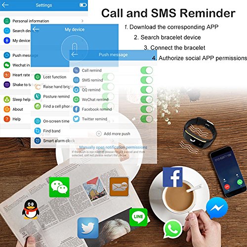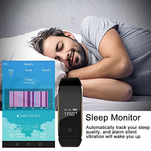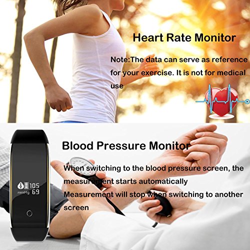 -. Feature : ★Multifunctional Sports Bracelet -- Blood Pressure and Heart Rate Monitor, Remote Camera Control, Date/Time Display, Pedometer, Clock Alarm, Calorie Burning Monitor, Sleeping Monitor, Incoming Call and SMS Reminder, Social Software(such as Facebook, Twitter, WhatsApp)Message Reminder, Sedentary Reminder and Anti-lost etc. / ★Hear Rate and Blood Pressure Monitor -- You can measure your heart rate / blood pressure by app or smart bracelet at any time, simply switch to the corresponding screen and wait for about 2 seconds to automatically measure your heart rate / blood pressure. / ★Notification Reminder -- It will notify you of incoming calls messages notifications of applications (whatsup/facebook/wechat, etc)by vibration, in which you will notice immediately. In addition, you can easily refuse by pressing and holding the main button for 3 seconds, such as during a conference or in a train, when you can not immediately answer the phone. / ★Activity Monitor -- Recording all day activity including steps, distance of movement, calories consumption. You can also set a goal according to your personal planning, enabling the bracelet to remind you to complete the daily mission, keeping healthy life. / ★Broad Compatibility/Waterproof IP67 -- Fully compatible with IOS and Android smartphones which with bluetooth version 4.0/4.0 above, IOS8.0 or above, Android 4.4 or above. In addition, we are equipped with IP67 waterproof and dustproof performance, you can safely use it in daily life, sweat, rain do not worry, please rest assured that the hand wash.