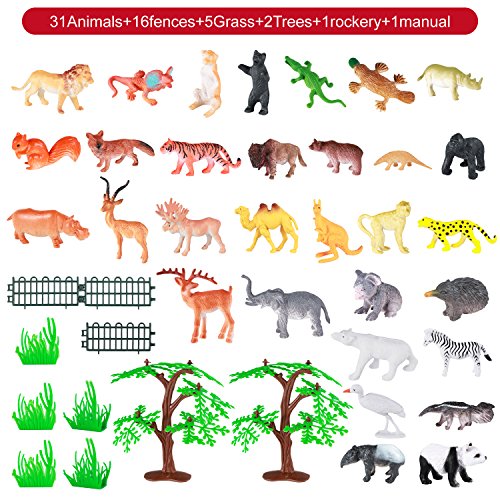 -. Feature : SAFETY, NO WORRY FOR YOUR KIDS TO PLAY: Animal figures made of plastic, solid, non-toxic paint. They are safe for your child to play with. / INCLUDE 54 PCS TOTALLY: 31 no repeats wild animals, 16 fence, 5 grass, 2 coconut tree, 1 rockery. Jungle Animals, includes the most popular animals -cheetah, elephant, gazelle, gnu, gorilla, hippo, lion, rhinoceros, tiger and zebra etc. Each of them about 2.2inch. / BEST LEARNING TOYS: This Farm animals is perfect for kids that ages 3 or up, it is easy for them to learn how to distinguish the realistic animals! Encourages hands on imaginative play in young children, which builds social, emotional, language, and thinking skills. / LET YOUR KIDS LEARN MORE ABOUT NATURE: Great resources for kids writing reports, participating in group projects or preparing for a trip to the zoo. / BUY WITH CONFIDENCE! 100% Money back guarantee! 100% brand new! Please feel free to contact us!