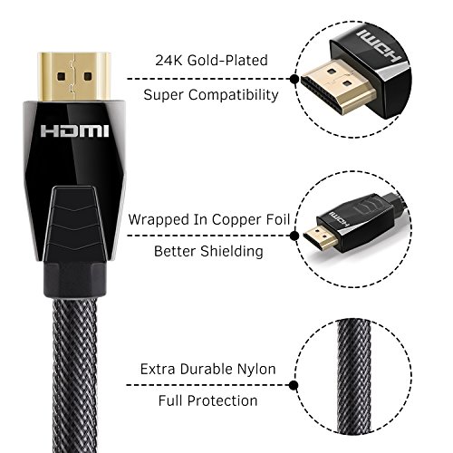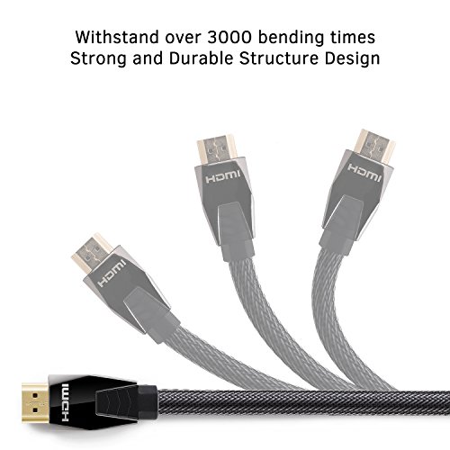 ✔Durability : The 24K gold-plated HDMI connectors reduces data loss, and provides an ultimate video experience, The 28AWG High Purity Oxgyen-free Copper Wiring prevents interference and signal degradation, and the Zinc-Alloy shell with nylon jacketed cable ensures stability &durability.