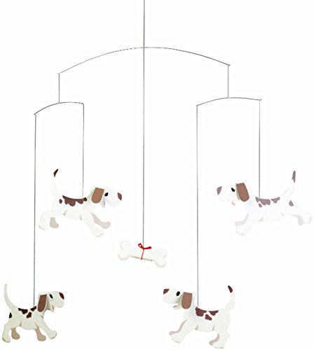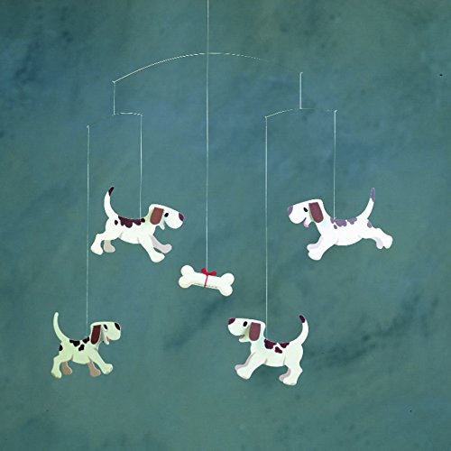 The mobile shows four puppies, running and playing. They all want a piece of the big bone. It is made for all dog lovers and is also suitable for a nursery.