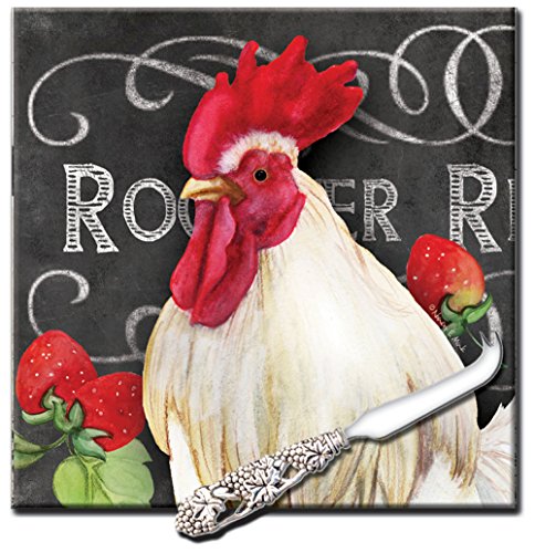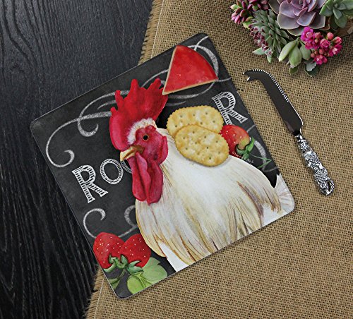 CounterArt 'White Rooster' 8-Inch Square Glass Cheese Board with Cheese Knife
