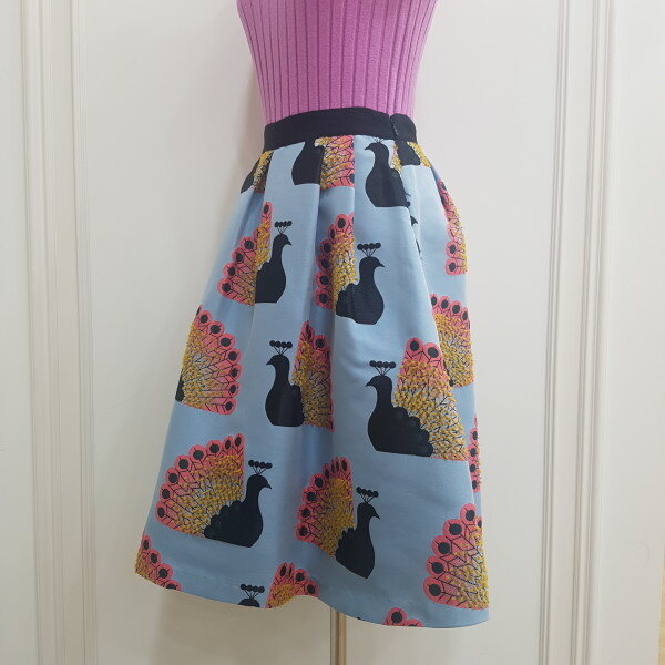 화사한 느낌의 공작새 프린팅과 우아한 A라인 실루엣의 스커트.