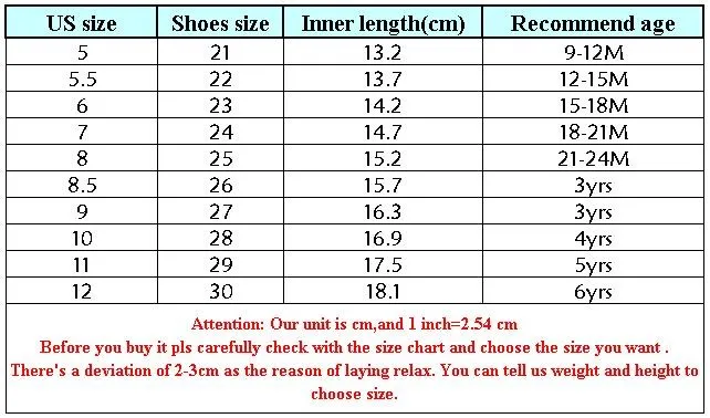 - 21 : 13,5 cm - 22 : 14. cm - 23 : 14,5 cm - 24 : 15 cm - 25 : 15.5 cm