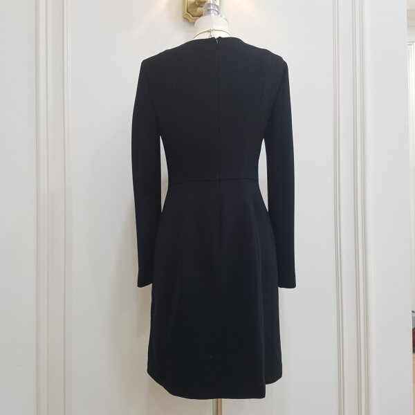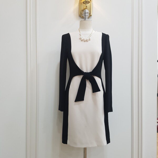 화이트,블랙 배색을 준 원피스로 앞으로 리본으로 묶을 수 있는 디테일이 포인트 입니다.
