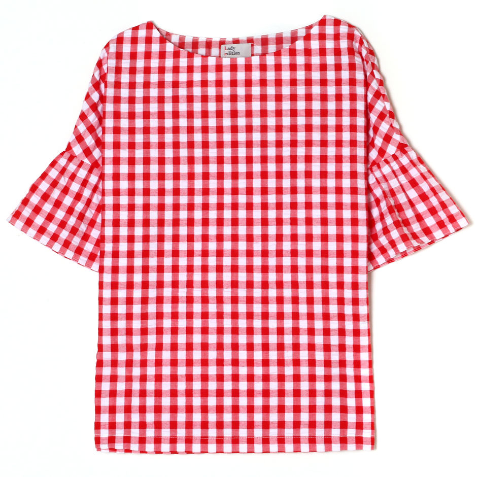 여성) 깅엄 러플 소매 블라우스 Detail Image 0