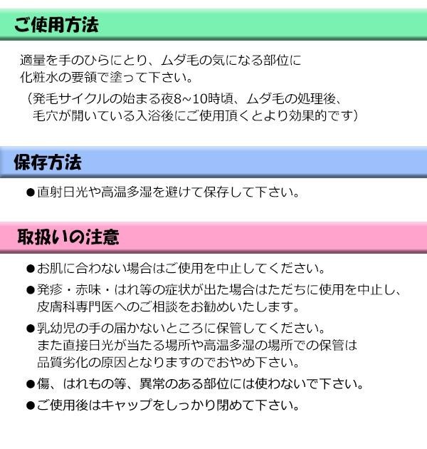 お肌への刺激が少ない抑毛ローションです。お手入れ後の肌の炎症を和らげ、古い角質を柔らかくする成分を配合しています。 |