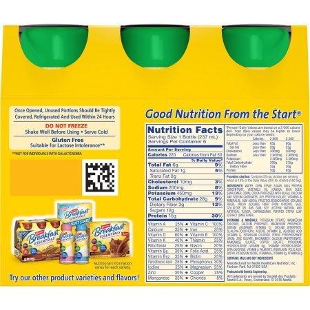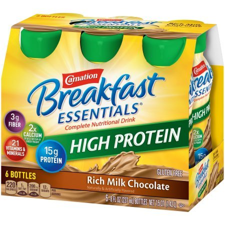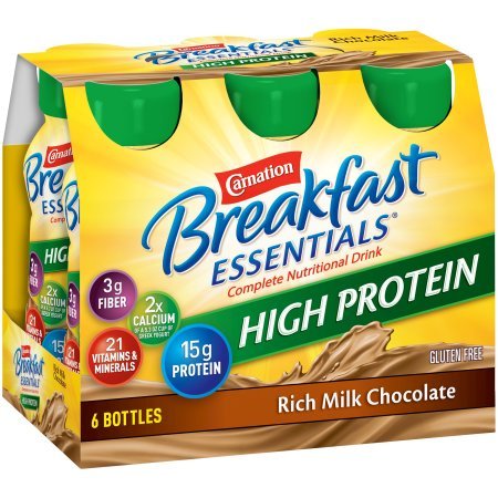 -. Binding : Health and Beauty -. Brand : Carnation -. EAN : 0607963716575 -. Feature : Calcium & vitamin D to help build strong bones. / 21 vitamins & minerals. / Packed with 15g protein to help start your day. / 3g Prebio1 fiber (Prebio1 is a proP.R.Ietary blend of prebiotic fiber to support digestive health). / Contains 55mg choline per serving and suitable for lactose intolerance. -. IsAdultProduct : 0 -. Label : Carnation -. LegalDisclaimer : Actual product packaging and materials may contain more and different information than what is shown on our website. We recommend that you do not rely solely on the information presented and that you always read labels, warnings, and directions before using or consuming a product. -. Manufacturer : Carnation -. MPN : 0005000040695 -. PackageQuantity : 5 -. PartNumber : 0005000040695 -. ProductGroup : Health and Beauty -. ProductTypeName : HEALTH_PERSONAL_CARE -. Publisher : Carnation -. Studio : Carnation -. Title : PACK OF 5 - Carnation Breakfast Essentials® High Protein Rich Milk Chocolate Complete Nutrition Drink, 8 fl oz, 6 count -. UPC : 607963716575