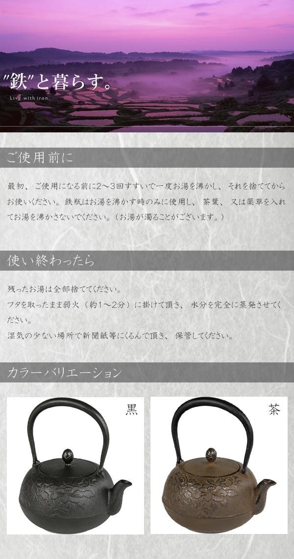 fk094igrjs大ぶりの花のデザインが魅力的な鉄瓶です。 製造国:日本 素材・材質:鋳鉄(外面:シリコン樹脂焼付塗装、内面:酸化皮膜仕上) 商品サイズ:Φ14.7×H19.2cm 仕様:食洗機・乾燥機不可満水容量:約1.0L※IH(100V・200V)には対応しておりません。※お届け地域により、別途運賃がかかる場合やお届けできない場合がございますので、お問い合わせ下さい。