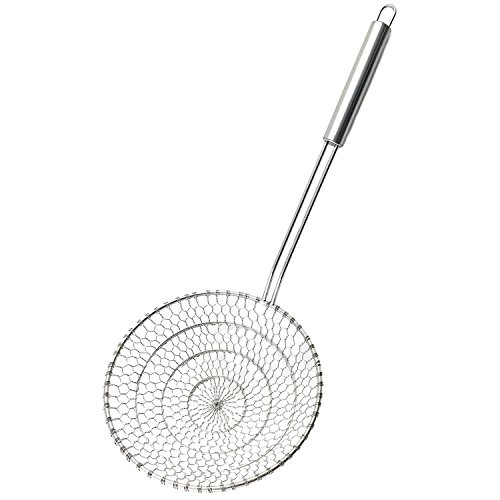 A must-have in any kitchen, Foods sit securely in the shallow mesh strainer basket, preventing splashes and unnecessary mess. This lightweight, yet sturdy, kitchen utensil has a long, hollow handle, which prevents heat transfer to stay cool during use and keep hands out of harms way. A kitchen essentials must, the Spider Strainer is perfect for Japanese cooking and Chinese recipes, making noodles and homemade dumplings and other types of pasta, blanching vegetables, deep frying, and so much more.