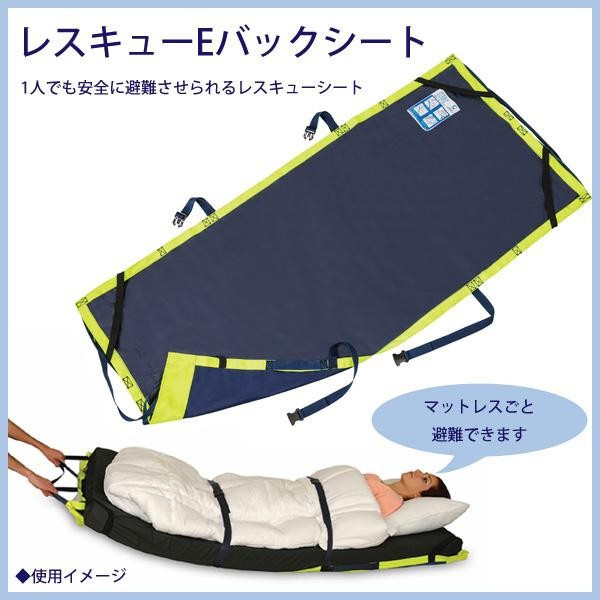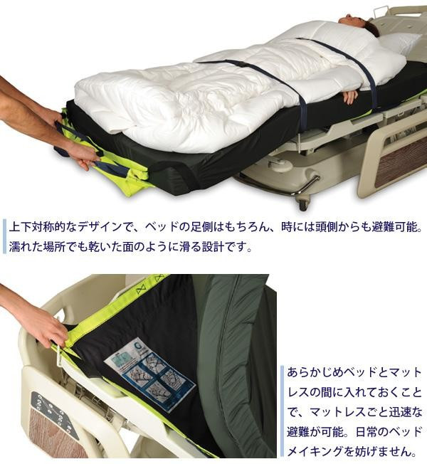 あらかじめベッドとマットレスの間に入れておくことで、マットレスごと迅速な避難が可能。日常のベッドメイキングを妨げません。上下対称なデザインで、ベッドの足側はもちろん、時には頭側からも避難可能。濡れた場所でも乾いた面のように滑る設計です。 |