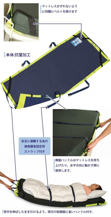 | あらかじめベッドとマットレスの間に入れておくことで、マットレスごと迅速な避難が可能。日常のベッドメイキングを妨げません。上下対称なデザインで、ベッドの足側はもちろん、時には頭側からも避難可能。濡れた場所でも乾いた面のように滑る設計です。 |