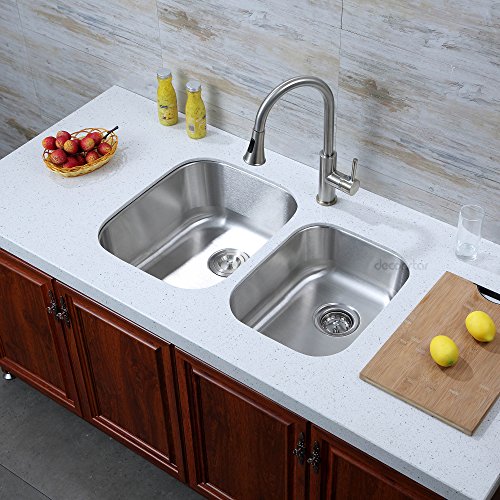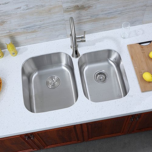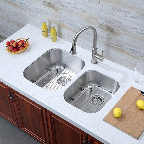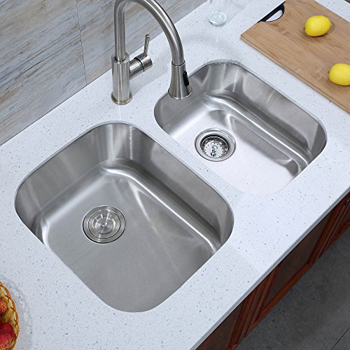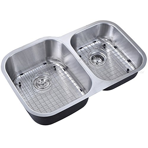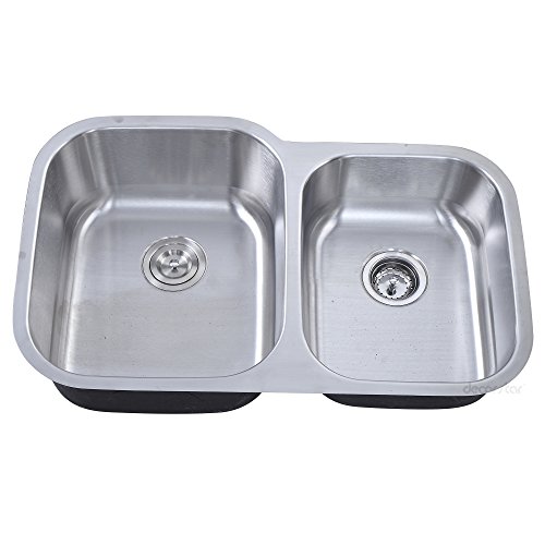 Decor Star P-008-B2 32 Inch Undermount 60/40 Offset Double Bowl 18 Gauge Stainless Steel Kitchen Sink cUPC, Grid, and Strainer Combo