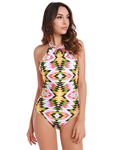 Feature : Braided high neck swimsuit with open back / Geo printed feature,makes you more attractive, charming, fashion and chic / Tropical one piece swimwar good for beach,swimming,holiday / Unique design makes you more modest,sexy