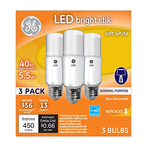 GE Lighting 63551 LED Brightstik 5.5-watt (40-watt Replacement), 450-Lumen Light Bulb with Medium Base, Soft White, 3-Pack
