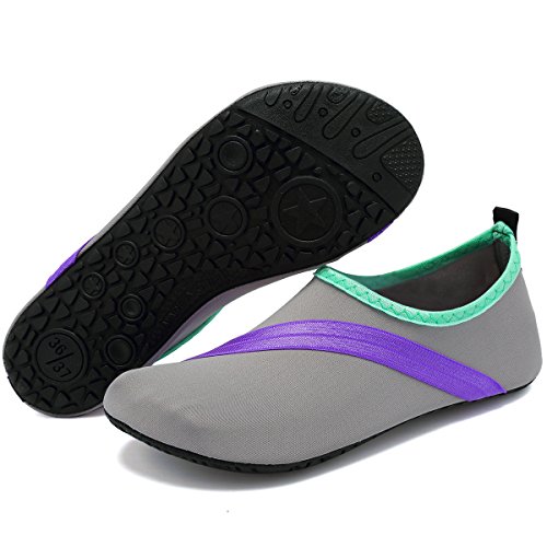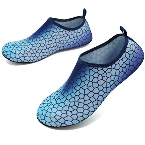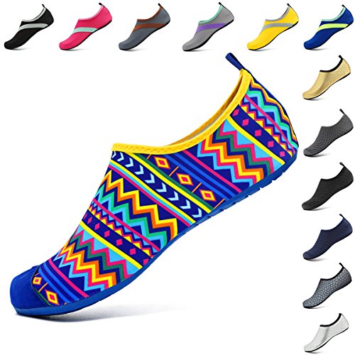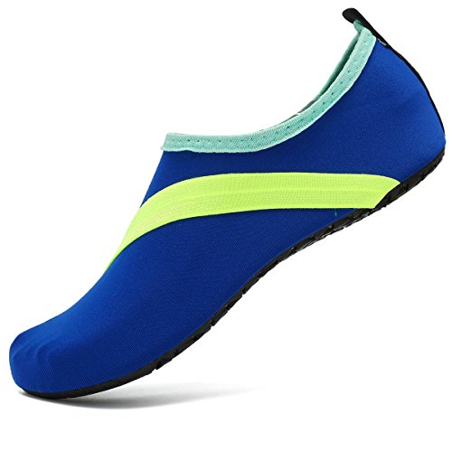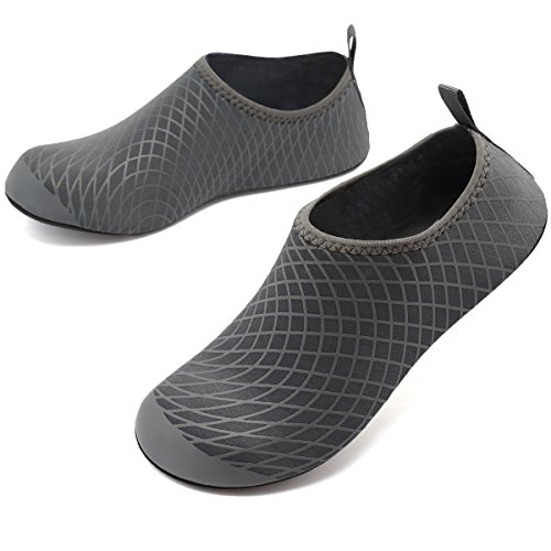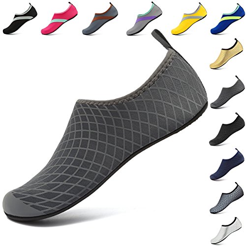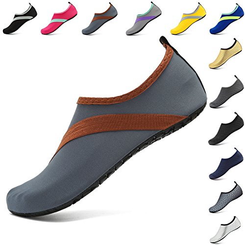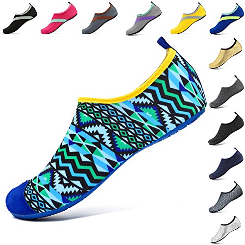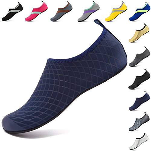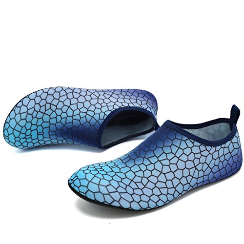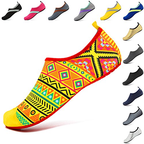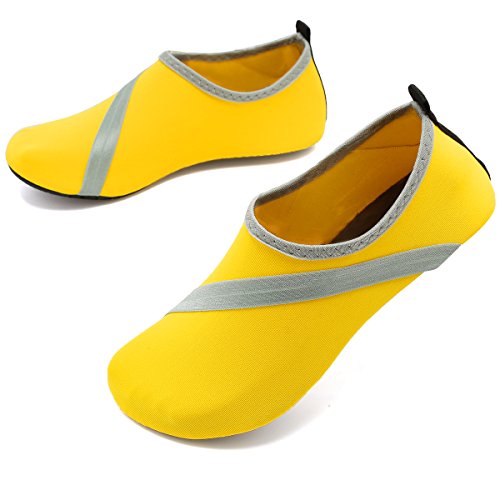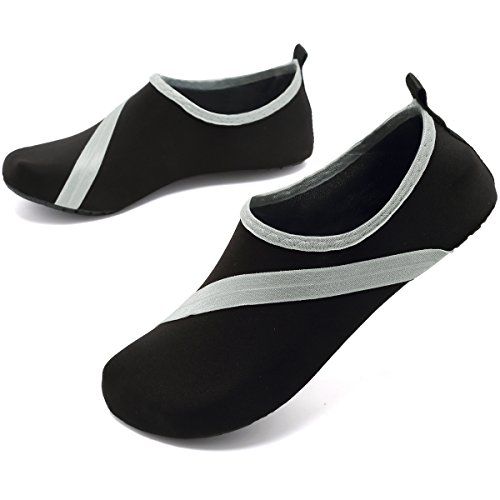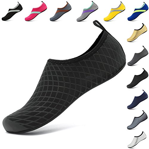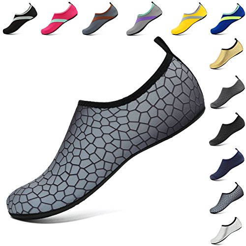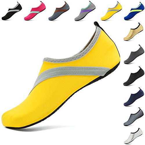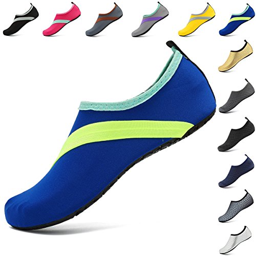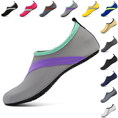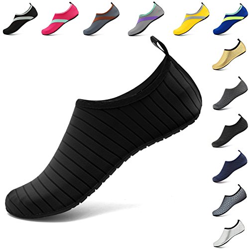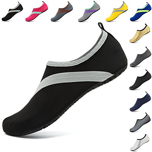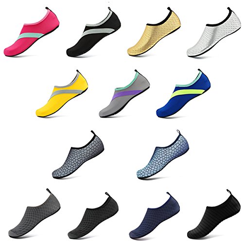Binding : Apparel Product Description VIFUUR Unisex Quick Drying Aqua Water Shoes Pool Beach Yoga Exercise Shoes for Men Women Size Chart US Women 3.5-4 = UK Women 2-2.5 = Foot Length 8.03in = EU 34-35 US Women 5.5-6.5/Men 5-5.5M = UK Women 3.5-4.5/Men 3-4 = Foot Length 8.46in = EU 36-37 US Women 7.5-8.5/Men 6-7 = UK Women 5.5-6.5/Men 5-6 = Foot Length 9.17in = EU 38-39 US Women 9.5-10.5/Men 7.5-8.5 = UK Women 7.5-8.5/Men 7-7.5 = Foot Length 9.69in = EU 40-41 US Women 11-12/Men 9.5-10.5 = UK Women 9-9.5/Men 8-8.5 = Foot Length 10.20in = EU 42-43 US Women 12.5-13/Men 11-11.5 = UK Women 9.5-10.5/Men 9.5-10.5 = Foot Length 10.71in = EU 44-45 US Women 13.5/Men 12 = UK Women 11/Men 11.5 = Foot Length 11.3in = EU 46 Product information: Gender: Women,Men(Unisex) · Material:elastic fabric · Sole Material:rubber · Style: Fashion · Item Type:Shoes,socks · Feature: Breathable,Massage,Lightweight · Appropriate Season: Spring,Summer,Autumn · Occasion:Indooroutdoor,Yoga Exercise,Beach,Pool,Surfing,Water Sports,Gym,Walking Why Choose Our Water Shoes? 1.Upgraded Anti-skid Rubber Sole The soft outsole is made from elastic thermoplastic rubber, which enhancing skid resistance and protecting you from slipping. 2.Stretchy Upper New fashion water shoes are breathable, smooth fabrics and sweat-absorption, it is comfortable, quick-dry. 3.360°Twist and Bend The whole water shoes are soft, elastic and can be bent as a small piece, which is easy to carry. VIFUUR Unisex Quick Drying Aqua Water Shoes Pool Beach Yoga Exercise Shoes for Men Women VIFUUR Skin Aqua Shoes Yoga Exercise Socks come with a wide range of styles and color for you to pick out for family day. 0