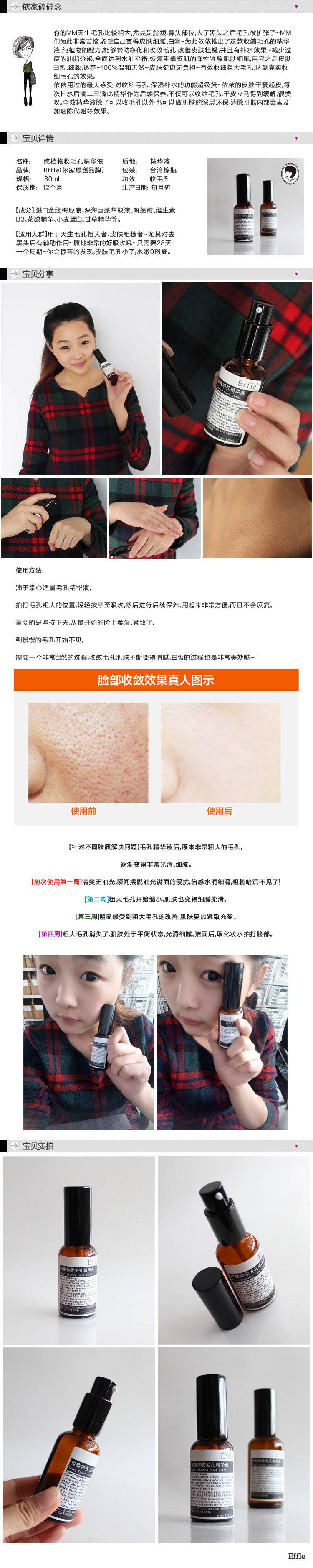有效收缩毛孔,具有保湿功效,一个皮肤周期开始改善,但因个人肤质而定,效果是慢慢显现的。