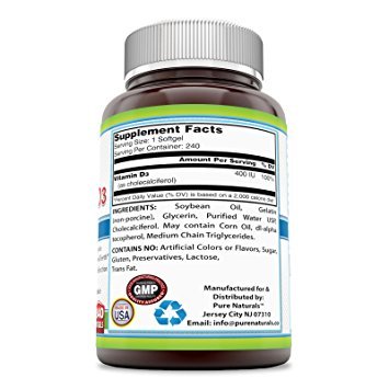 -. Binding : Health and Beauty -. Brand : Pure Naturals -. IsAdultProduct : 0 -. Label : Pure Naturals -. Manufacturer : Pure Naturals -. ProductGroup : Health and Beauty -. ProductTypeName : HEALTH_PERSONAL_CARE -. Publisher : Pure Naturals -. Studio : Pure Naturals -. Title : Pure Naturals Vitamin D3, 400 IU