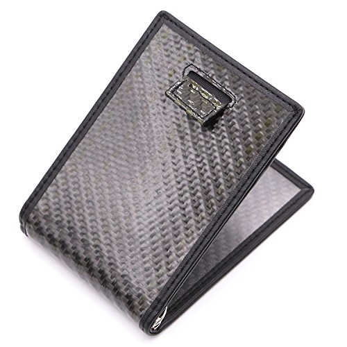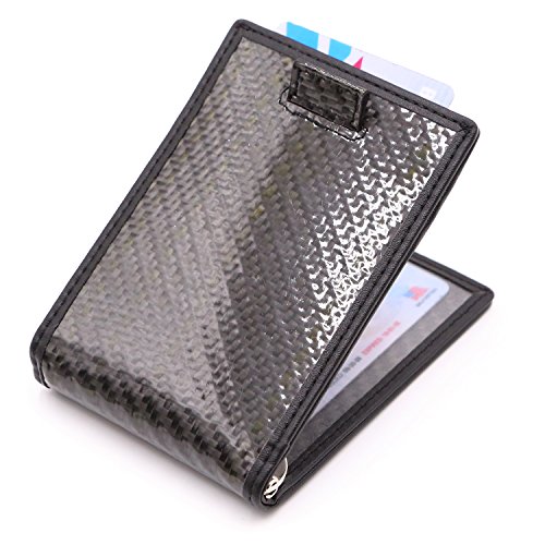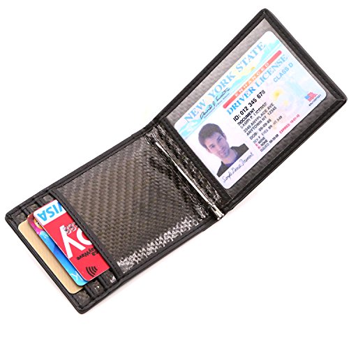 -. Feature : Premium Carbon Fiber (Very Strong and durable material) + Genuine leather stitched wallet for gentlemen. / Measure: 4.2"x 3" x 0.35" (10.6cm x 7.7cm x 0.9cm); Looks modern and super functional. / Slim Men Wallet: Interior sP.R.Ing money clip keeps to store your money securely, so the Cash wont fall out if you hold the wallet upside down; 3 inner RFID credit card slots, 1 ID window with finger location, quick access, very easy for cards in and out; 1 top center card slot with Pull-Tab design allows you to quickly access your cards, perfect as a credit card holder, debit card, bank card, medical card case; / RFID Blocking Wallet: keeps your vital information in cards from being stolen. Does Block 13.56 MHz RFID signals / Stop Thieves from Obtaining Personal and account information; Blocking all RFID scanners and readers. / Buy Confidently: 100% 6 Month Money Back Guarantee; No questions asked and hassle free.