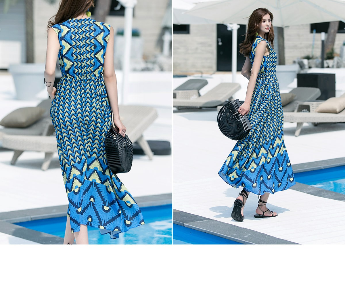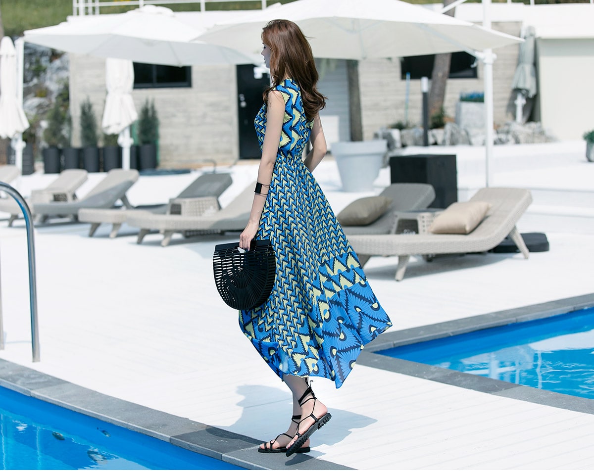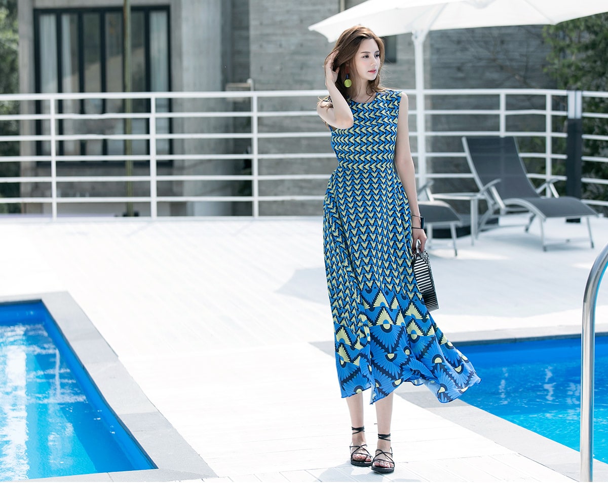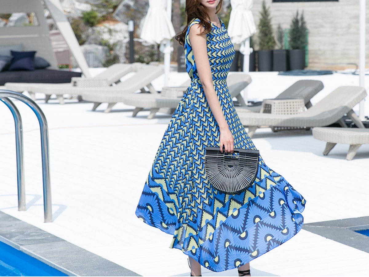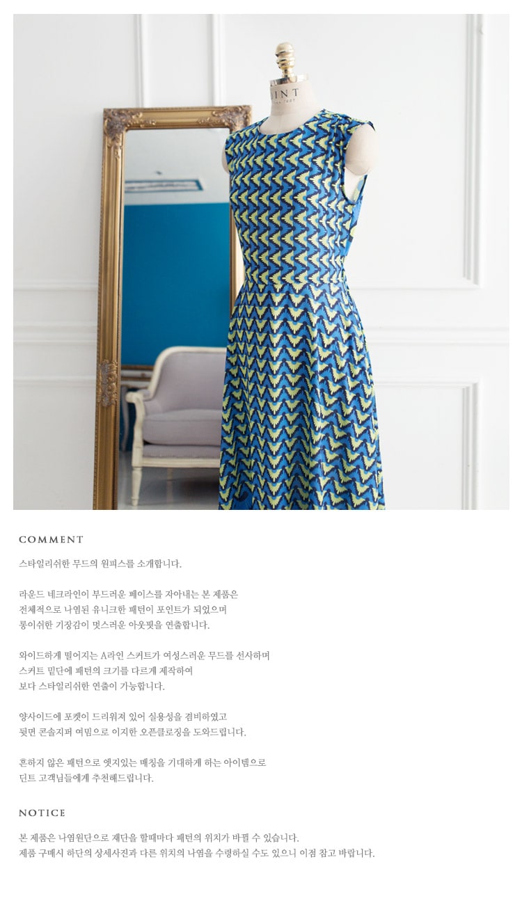 D3611 유닉 배색 패턴 롱 원피스 Blue mix