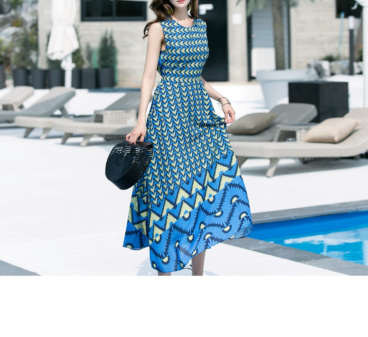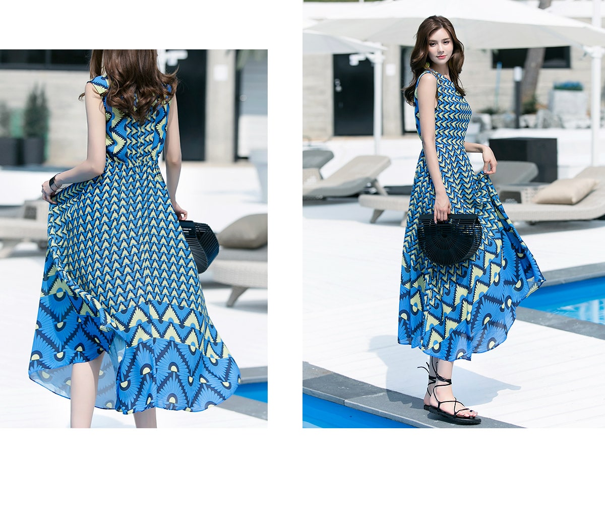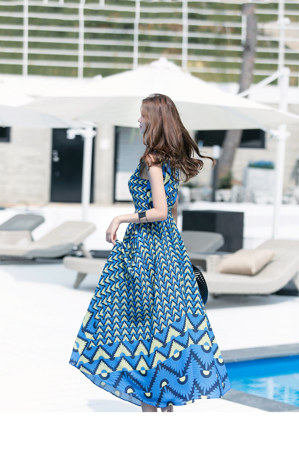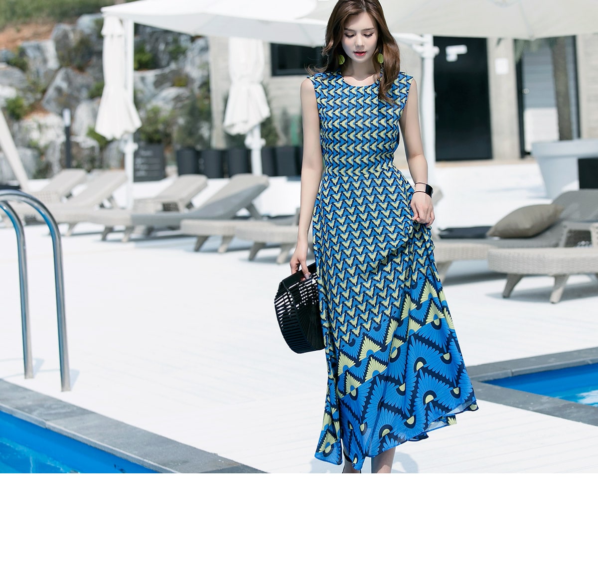 D3611 유닉 배색 패턴 롱 원피스 Blue mix