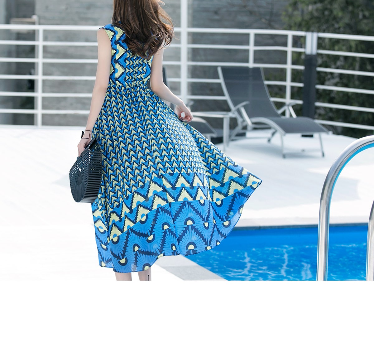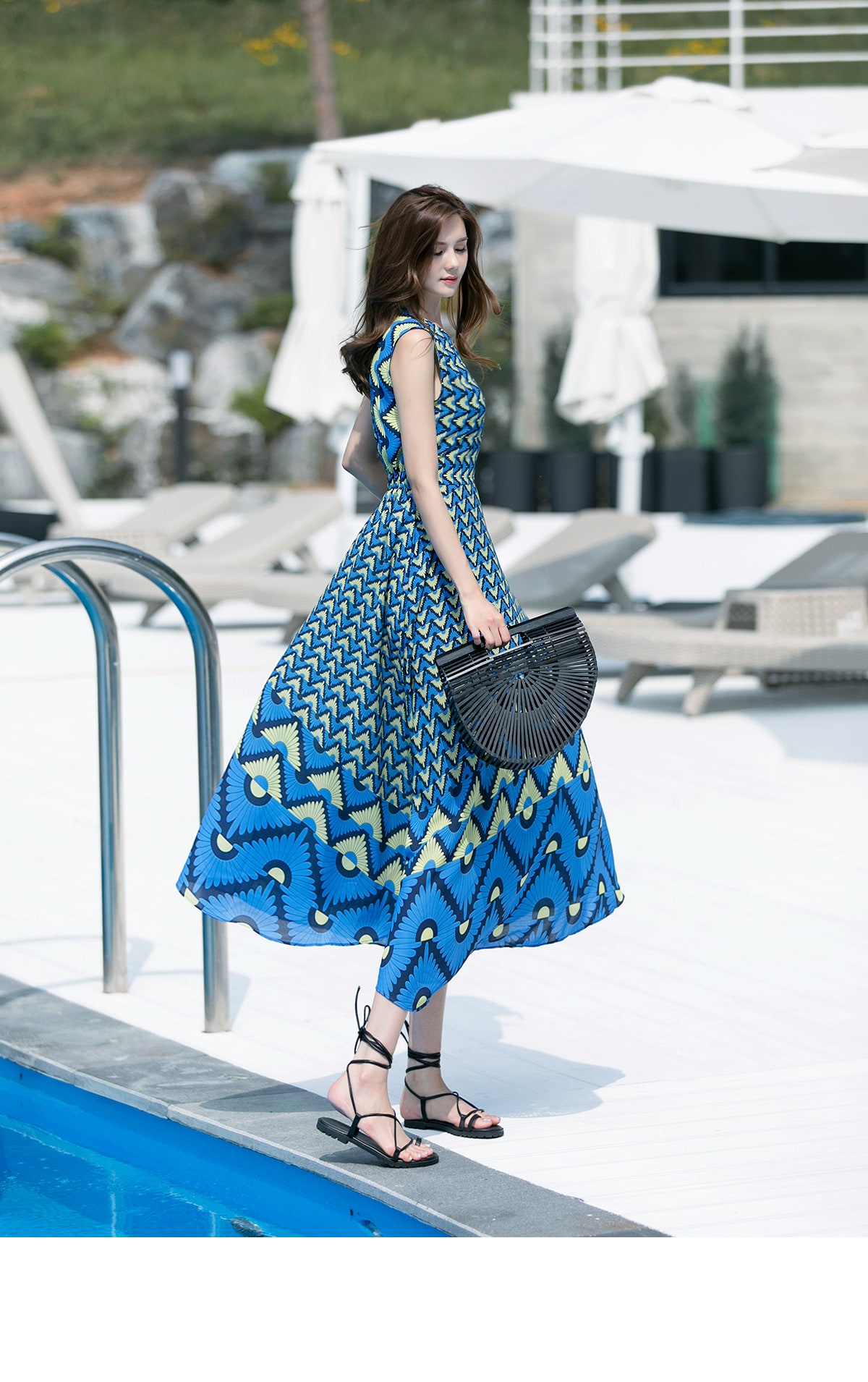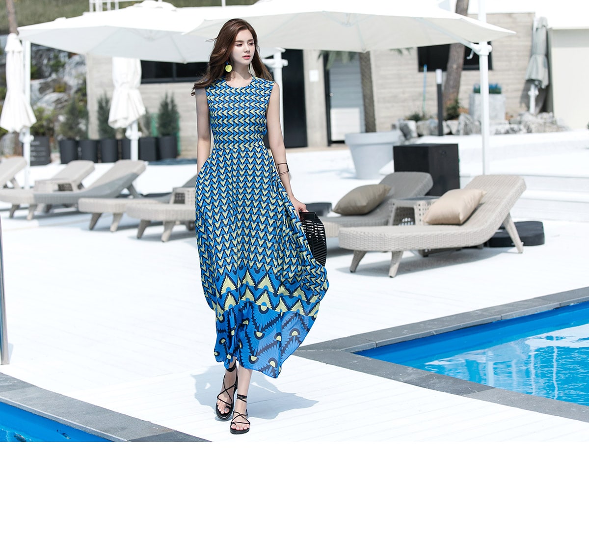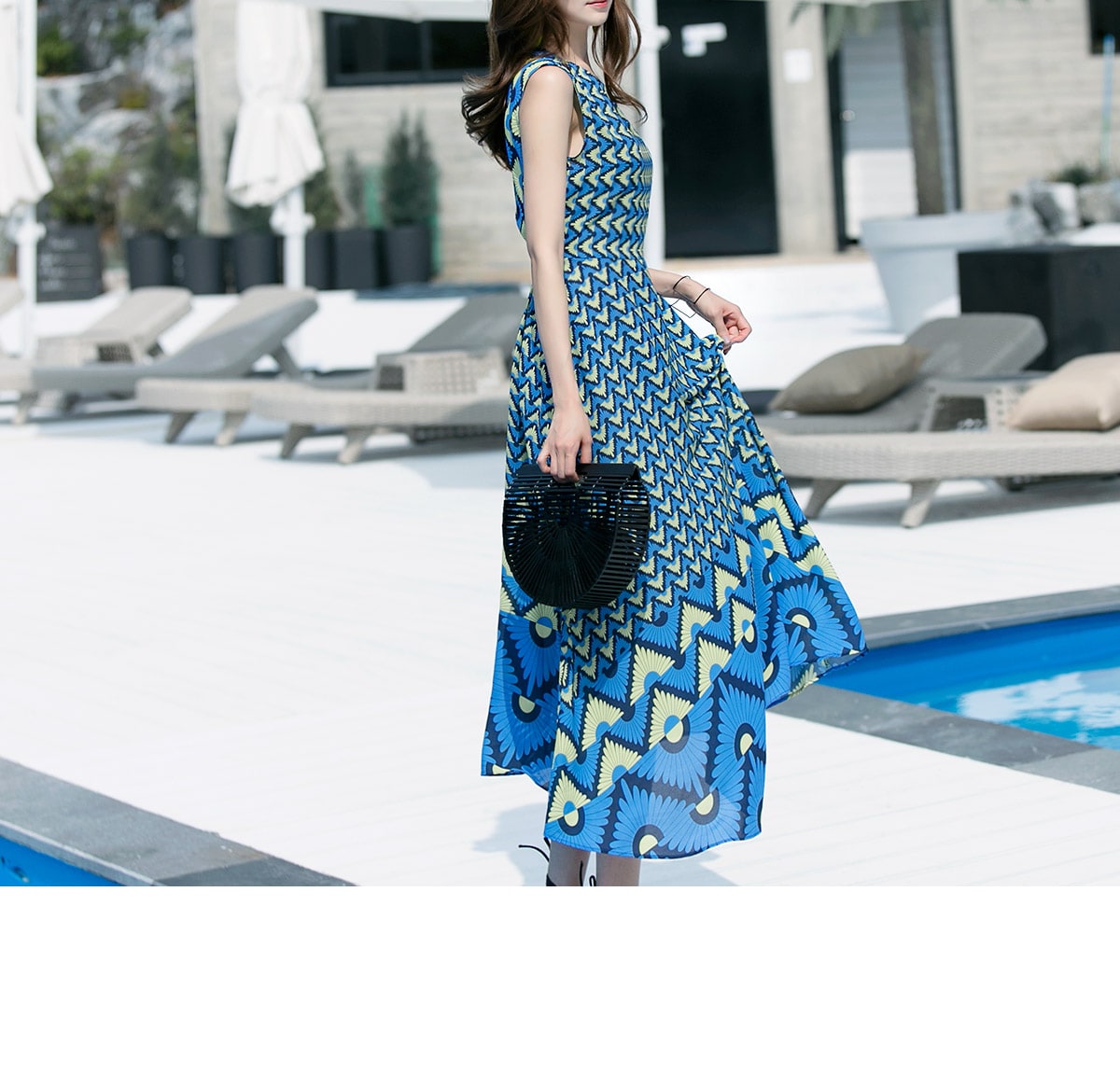 D3611 유닉 배색 패턴 롱 원피스 Blue mix