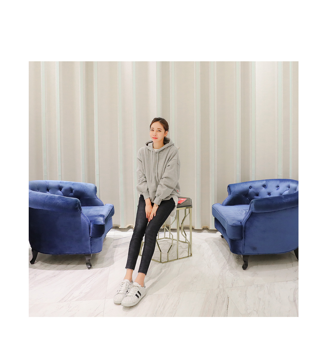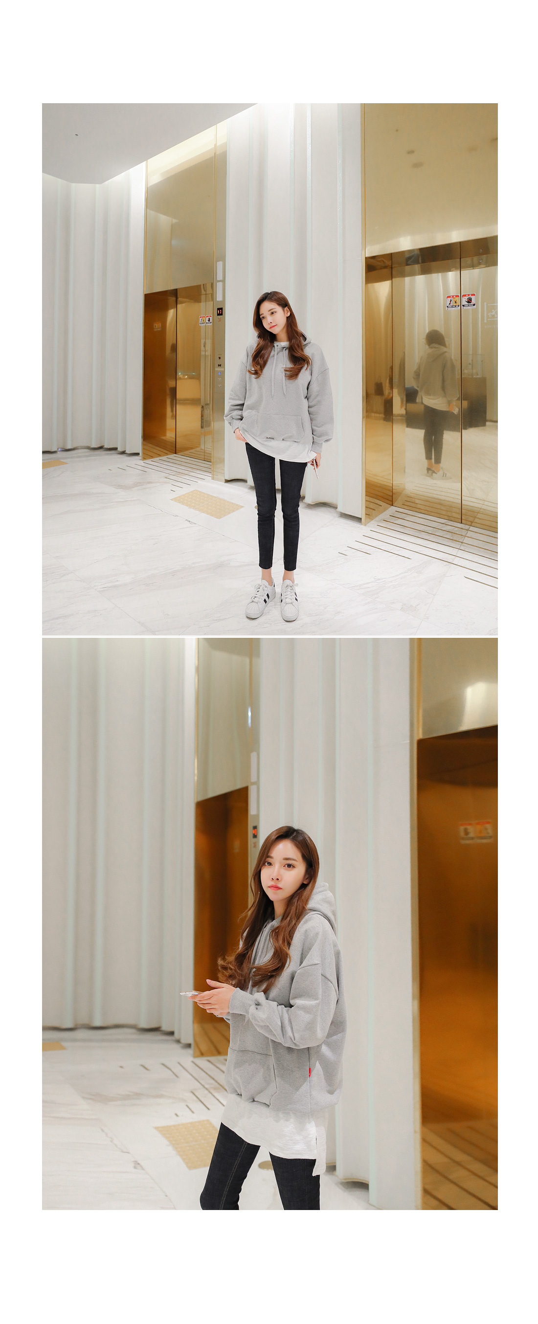 큼지막한 후드가 부착되어 있는 후드 디자인으로 편안하게 입기좋은 소재구요.