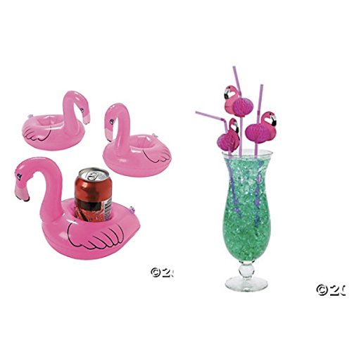 FLAMINGO Pool Party FAVORS - Four (4) Inflatable Floating Coasters and 1 Dozen (12) Beverage Cocktail Straws LUAU DECOR Decorations Table