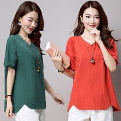 | Summer new literary cotton Women's short-sleeved t-shirt loose bigyards long section stitching wild shirt compassionate tide | |