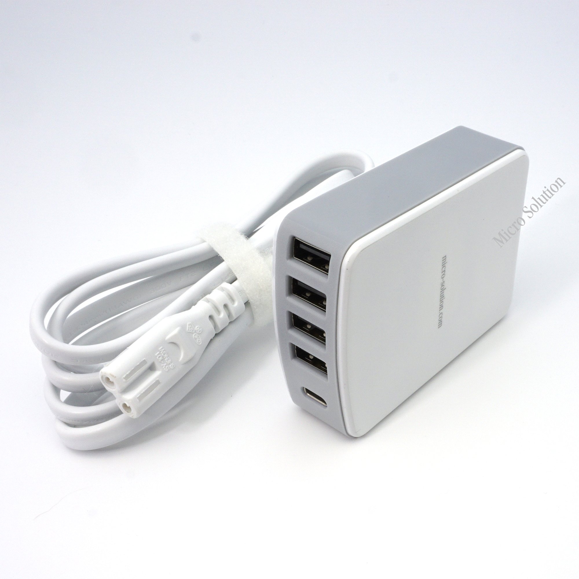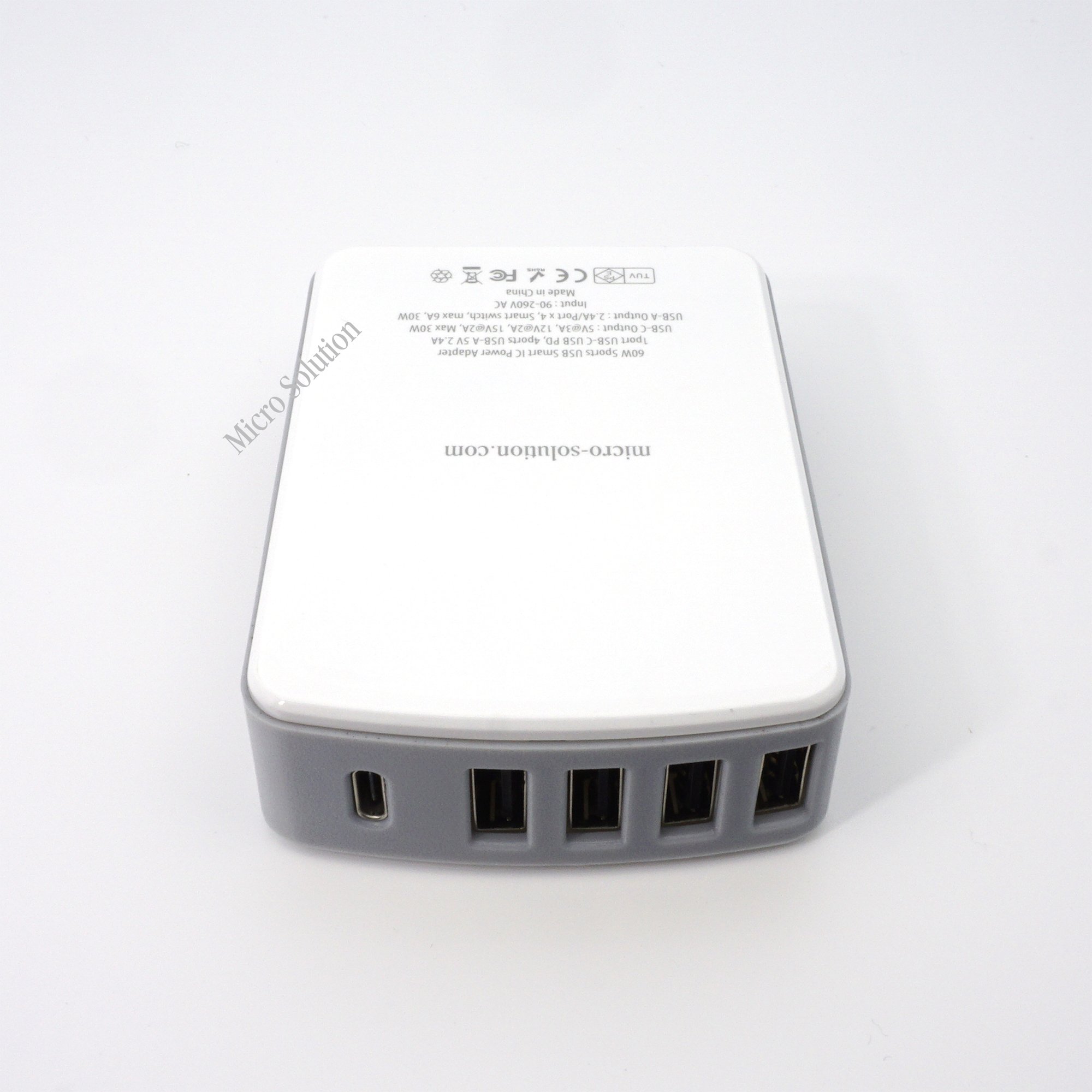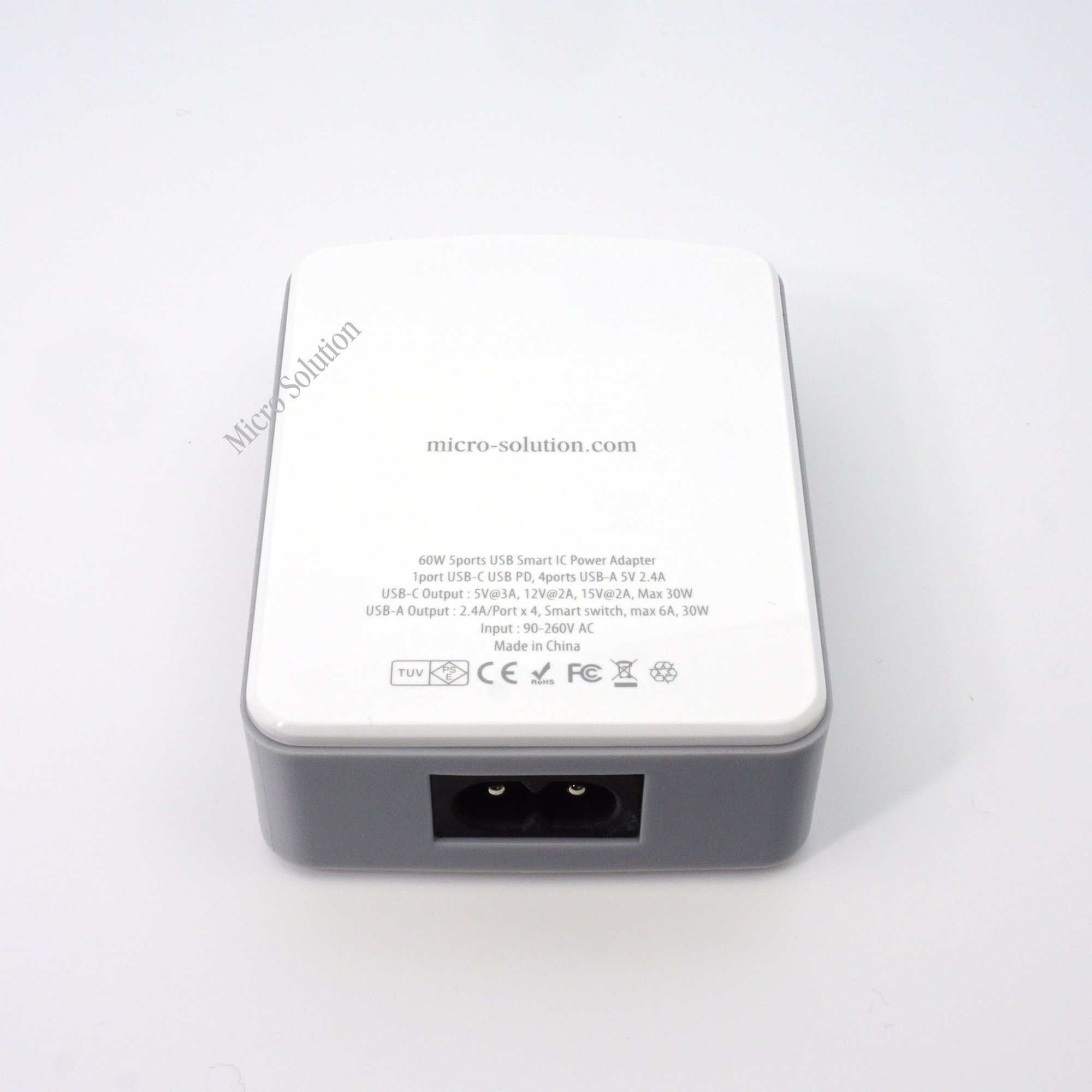 □ Compact high-performance Input: AC 90-260V 5 ports power adapter: 1 x USB-C, 4 x USB / Total Power Rate: 60 W USB-C Power Delivery Output: 5 V @ 3A, 12 V @ 2A, 15 V @ 2A, max