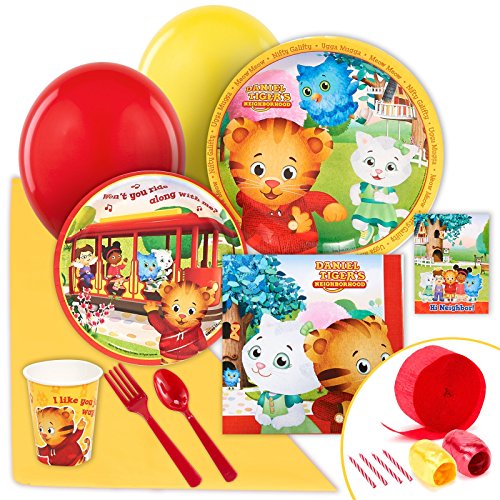 -. Feature : Includes (8) birthday invitations, (8) paper dinner plates, (8) paper dessert plates, (8) 9 oz. paper cups, (20) 2-ply paper lunch napkins, a plastic tablecover, (8) sets of plastic forks and spoons, (24) candles, (12) latex balloons, (2) curling ribbons, and crepe paper roll. / Add matching tableware, favors, accessories, or a party kit bundle to complete your Daniel Tiger birthday.