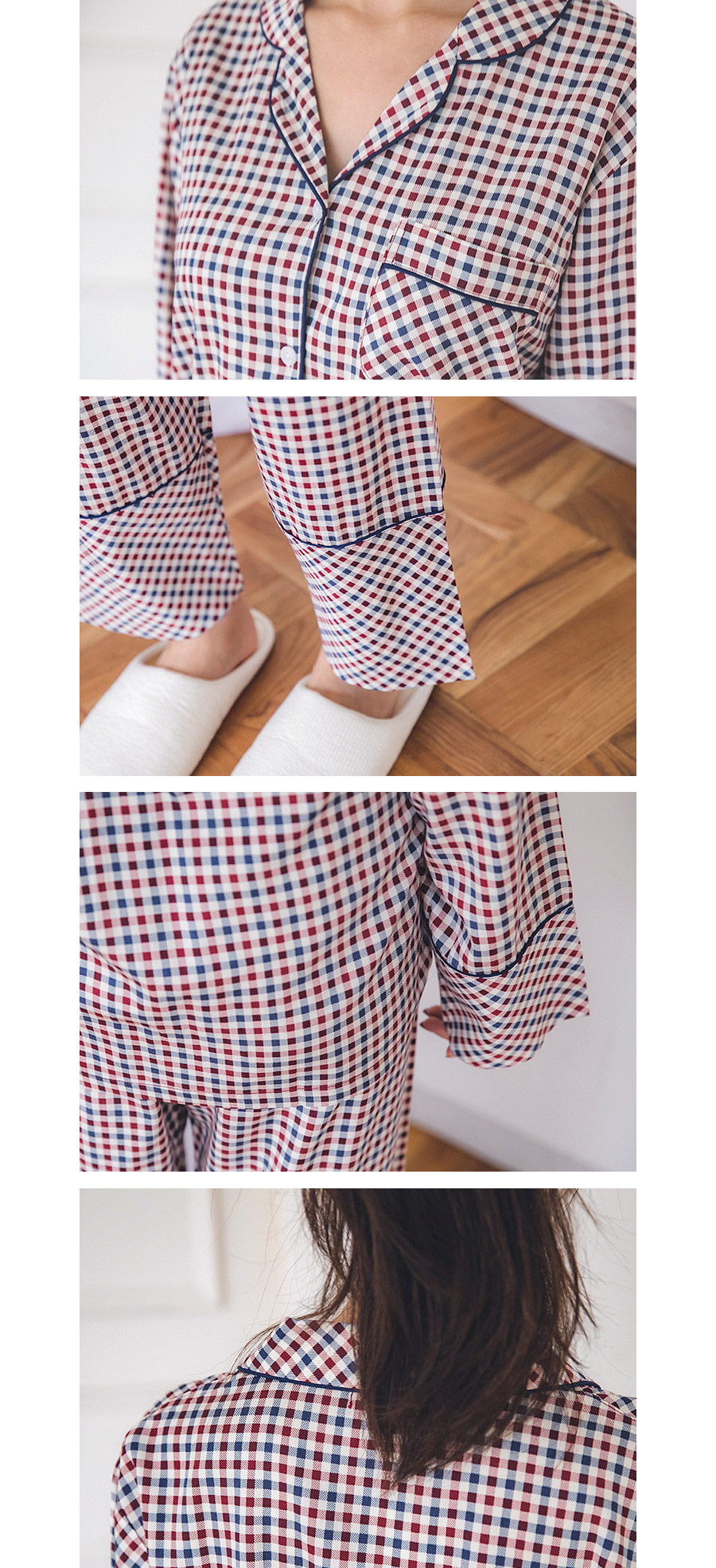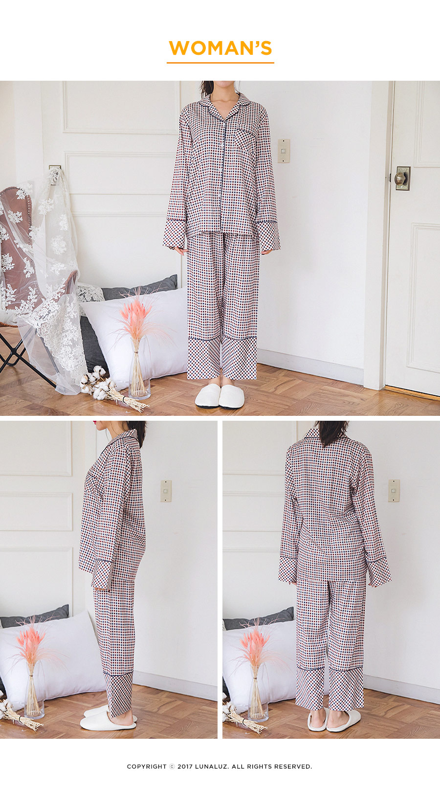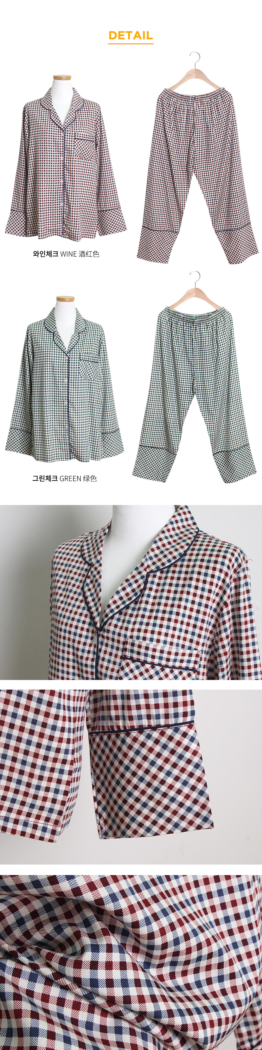 A/W 가을 버전 프리미엄 modal함유 소재의 ‘어텀체크’ 잠옷이에요:> 프리미엄 modal 면소재는 일반 면에 비해 수축이 적고 탄성 회복률이 좋아 형태 유지가 뛰어납니다. 위생적이고 천연소재로 고급스러운 윤기가 흐르며 반복 세탁에도 부드러움을 유지하는 소재입니다. 피부에 닿는 느낌이 상쾌하고 좋아 한 번 입으시면 계속 구매하는 잠옷이랍니다. 통풍성과 땀 흡수력이 탁월하고 자연향균 향취성이 있어 퀄리티가 굉장히 높습니다. 면보다 흡수성이 좋아 시원함은 물론이고 숙면을 취하시기 좋습니다. 베이지 컬러를 베이스로 가을의 무드가 풍기는 체크 잠옷이랍니다. 고급스러운 와인컬러와 세련된 그린 컬러 2가지로 구성해 보았습니다. 잔잔한 고급스러움이 묻어있는 원단으로 부모님 잠옷으로도 추천해드리고 싶어요. DETAIL깔끔한 카라 스타일로 카라에서 클로징 부분까지 파이핑으로 꼼꼼하게 봉제하고, 미니 포켓을 달아 전체적인 완성도를 높여주었습니다. 100% 국내 생산으로 봉제와 소재 마감이 깔끔하고 퀄리티가 높습니다.