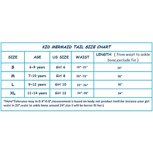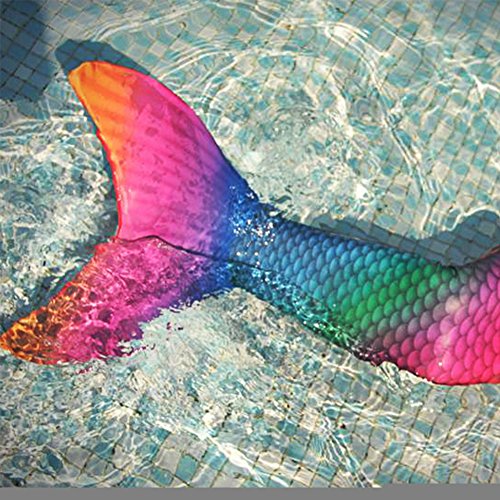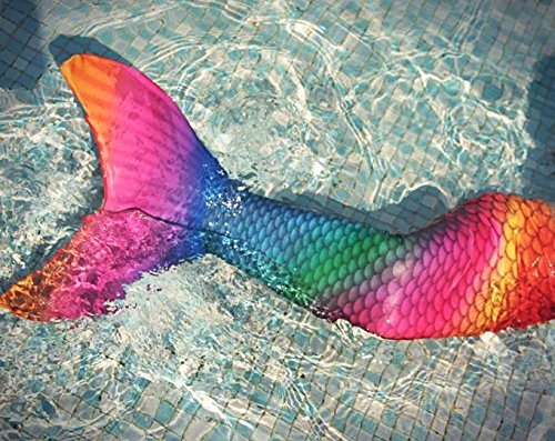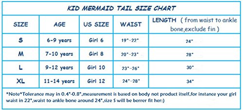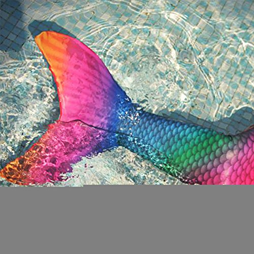 -. Feature : NICE DESIGN AND HIGH QUALITY: This mermaid tail swimsuit is made from high quality material lycra and spandex. Breathable swimsuit fabrics with high elastic 4-way stretch. / DIFFERENT SIZES AVAILABLE: This mermaid tail swimsuit is available in 4 sizes. US Size S (Girl 6), Age (6 to 9 years), Waist 19 to 22in, Length 24in; US Size M (Girl 8), Age (7 to 10 years), Waist 20 to 23in, Length 28in; US Size L (Girl 10), Age (9 to 12 years), Waist 23 to 26in, Length 30in; US Size XL (Girl 12), Age (11 to 14 years), Waist 24 to 27in, Length 34in. / MONOFIN COMPATIBLE: Special designed to pair one of our nice designed monofin. Engineered monofin provides superior swimming propulsion and control. / BEAUTIFUL COLORS: The color of this mermaid tail swimsuit is rainbow, which looks very beautiful when in it. / EASY AND COMFORTABLE: This mermaid tail swimsuit is made from lycra, super comfortable and stretchy, and our mermaid tail swimsuit creates the perfect shape in the water.